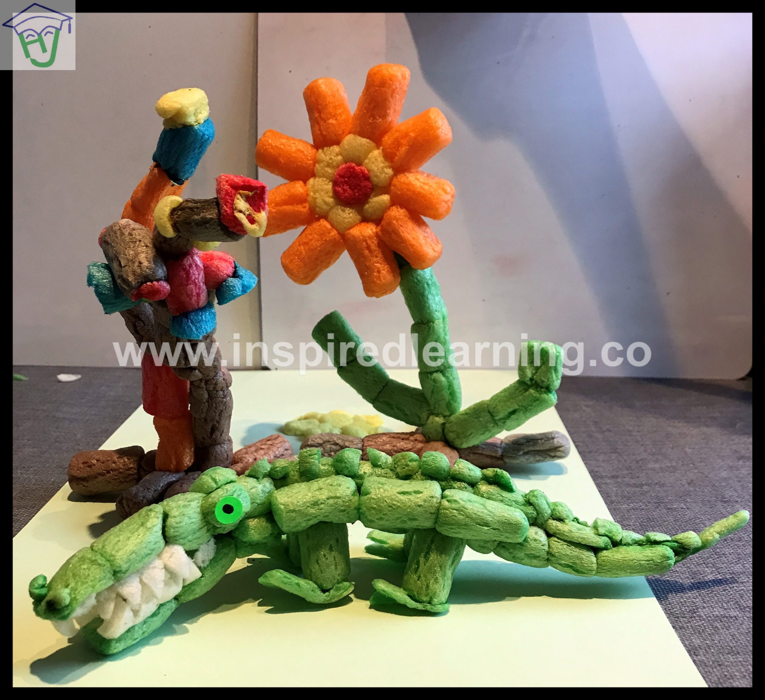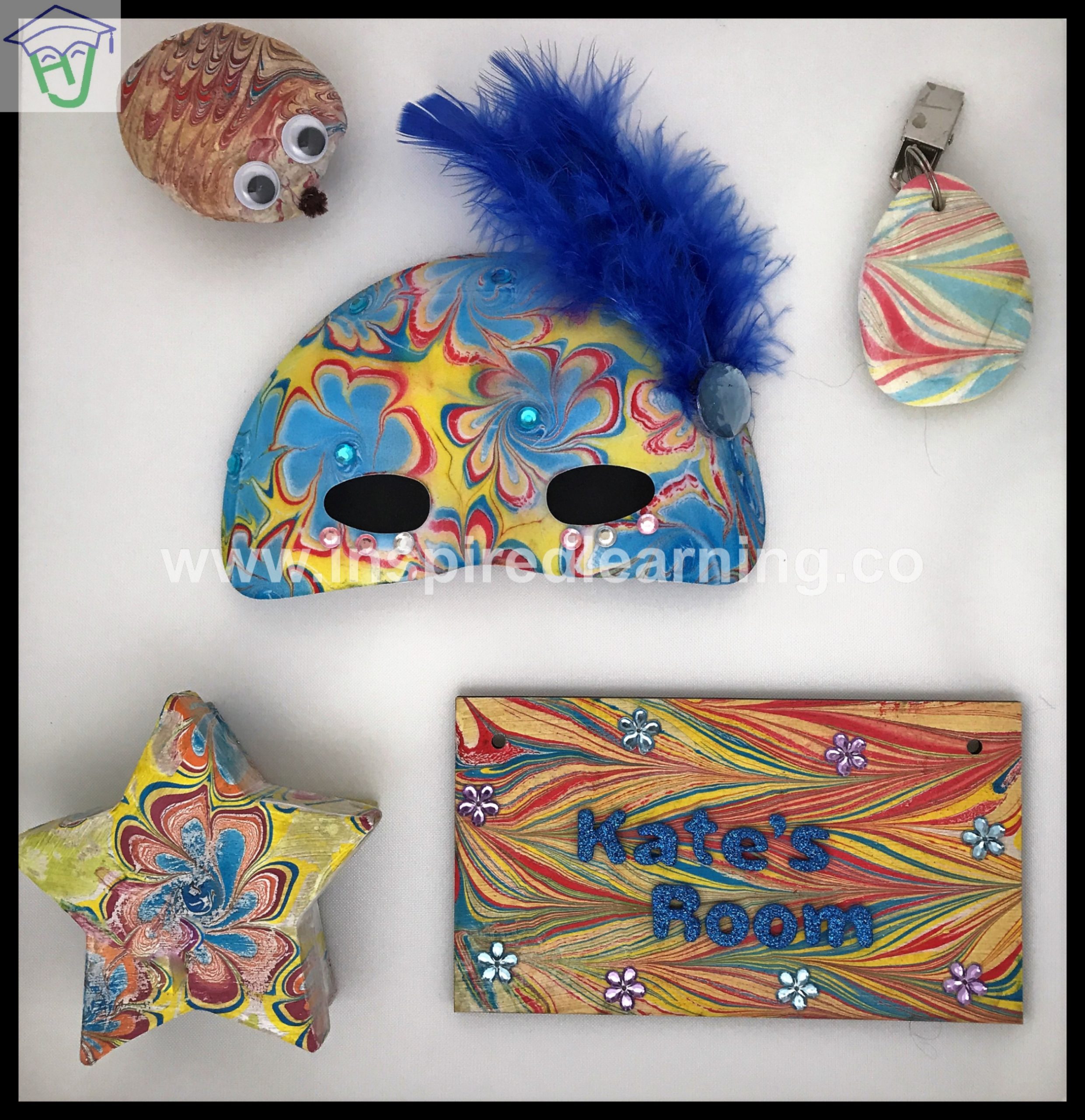painting, drawing, marbling, mask making, peg stamping, embossing, die cutting, decoupage, weaving, pottery, bookmaking and modelling in 3D using a wide range of media including maize, pipe cleaners, straws, cardboard, wood and recycled materials. I aim to use/reuse recycled, recyclable and/or sustainable materials whenever possible.